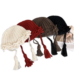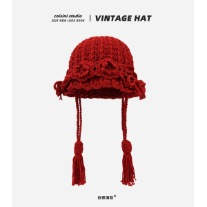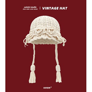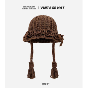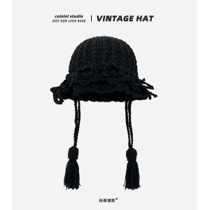 2025新款复古花朵手工编织辫子毛线帽子女秋冬保暖百搭流苏针织帽