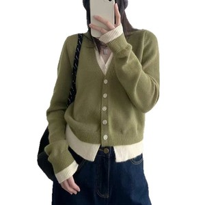 V领撞色假两件针织衫外套女2025秋冬新款韩系慵懒风针织衫上衣女
