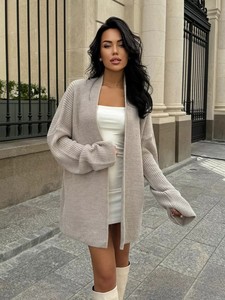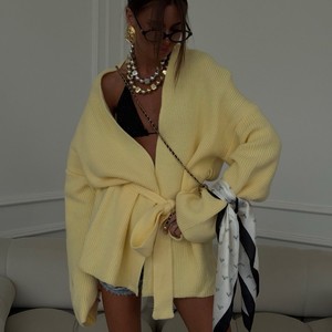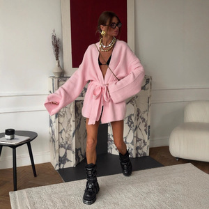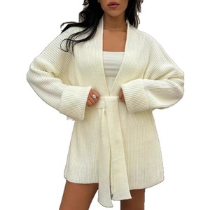 跨境欧美风纯色中长款针织衫毛衣女秋冬季和服系腰带针织开衫外套