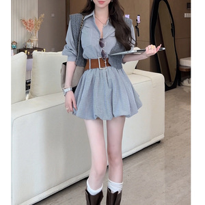 2025新款秋蓝屿格子裙设计感翻领腰部收腰长袖格子衬衫连衣裙短裙