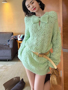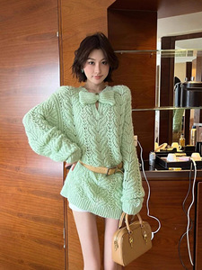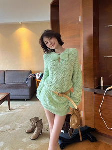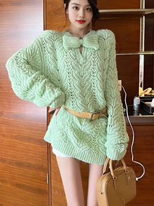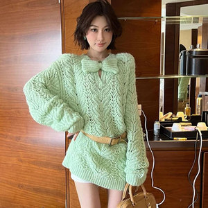 绿色蝴蝶结镂空粗线套头毛衣女秋季2025新款宽松慵懒风软糯针织衫