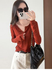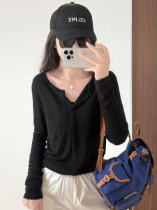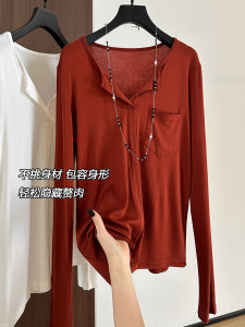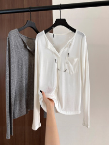 J致轻柔早秋V领轻盈透气慵懒宽松长袖T女百搭显瘦内搭外穿打底衫