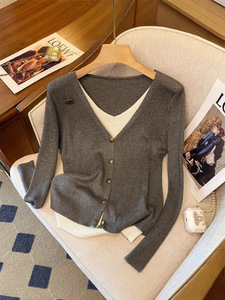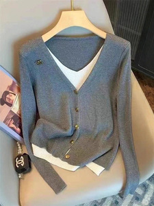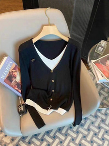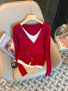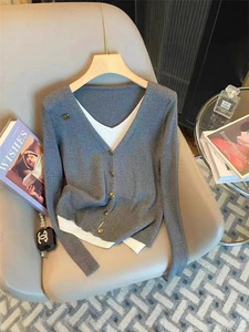 假两件v领针织衫女秋冬季新款修身显瘦内搭毛衣短款上衣打底衫
