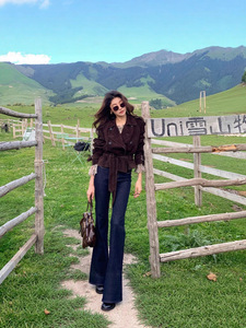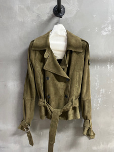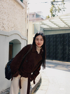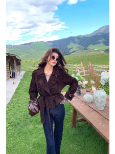 2025秋冬休闲宽松進口麂皮绒真皮风衣外套气质夹克风衣配腰带