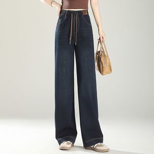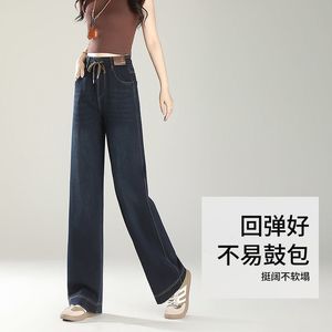 松紧高腰牛仔裤女春秋新款宽松显瘦百搭弹力窄版直筒阔腿长裤