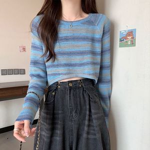 2025新款春秋法式复古设计感条纹针织衫女不规则宽松短款长袖上衣