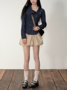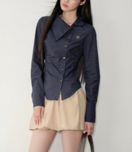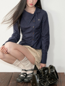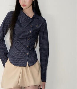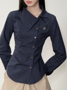 深藏青斜翻领复古格纹掐腰显瘦长袖衬衫衣女
