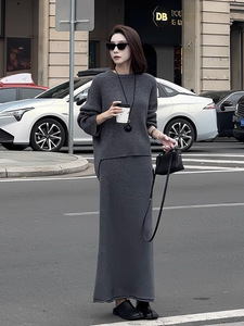 高级感老钱风独特绝美灰色坑条前短后长毛衣鱼尾半裙两件套女秋季