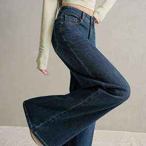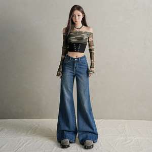 复古水洗蓝色牛仔裤女早秋时尚微喇叭拖地阔腿裤代发