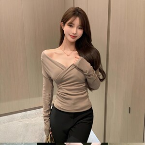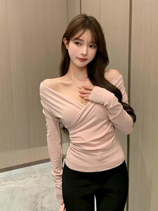 温柔风V领长袖T恤女秋冬内搭修身收腰气质打底衫设计感显瘦小上衣