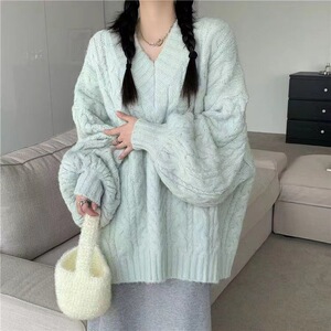 2025V领加厚麻花毛衣女秋冬宽松外穿慵懒风设计感保暖针织衫上衣