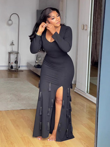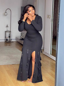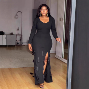 亚马逊欧美2025秋季新款无袖方领长袖连衣裙蝴蝶结开叉大摆长裙子