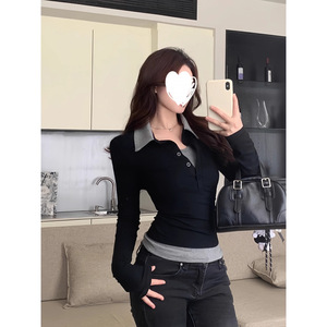 黑色辣妹假两件polo正肩长袖t恤女春季修身显瘦纯欲镂空短款上衣