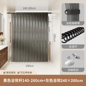 【浴帘套装】磨砂黑140-260cm浴帘杆+雅灰浴帘长240cm