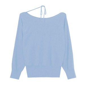 蓝色斜肩系带设计感收腰长袖薄针织衫女2025新款秋季流行穿搭上衣