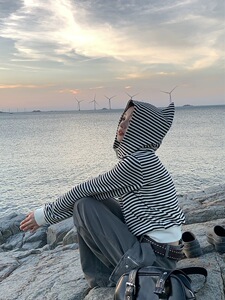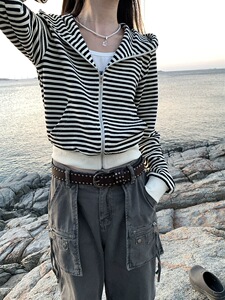 小恶魔条纹外套女春秋新款韩系短款连帽拉链卫衣开衫