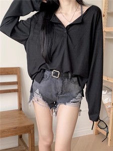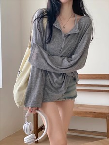 慵懒风小众休闲v领白色长袖防晒T恤罩衫女薄款宽松显瘦外搭上衣