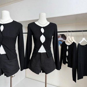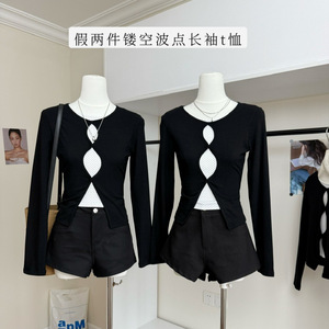 2025假两件镂空波点长袖t恤女秋季新款修身针织上衣