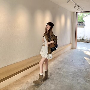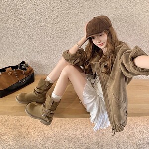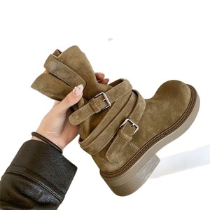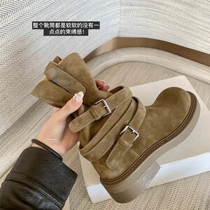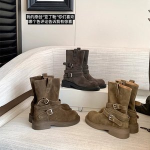 软软亚丁靴~复古绒面皮带扣厚底马丁堆堆短靴女春秋季炸街西部靴