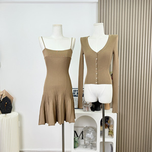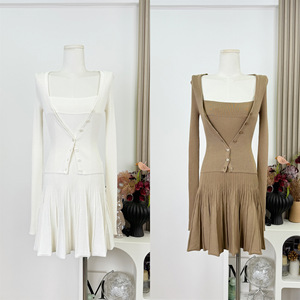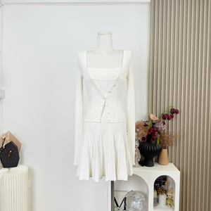 一整套ootd穿搭套装女短款针织修身开衫上衣A字百褶吊带裙