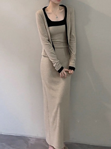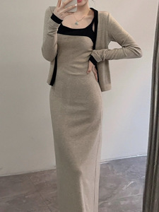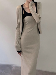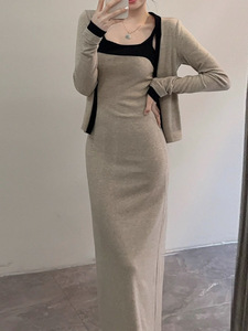 秋季新款撞色吊带内搭修身显瘦短款长袖开衫两件套