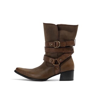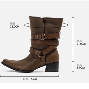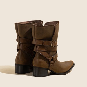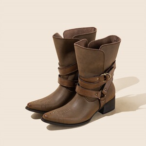 速鼎家棕色尖头短靴女2025新款做旧废土风中筒靴刺绣西部牛仔靴子