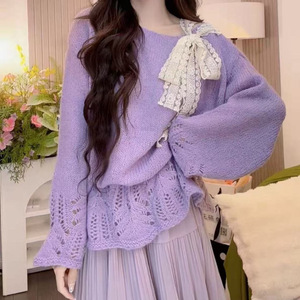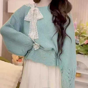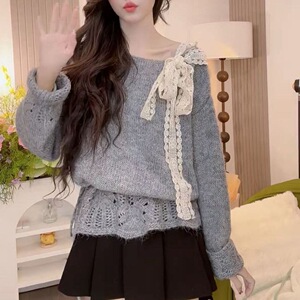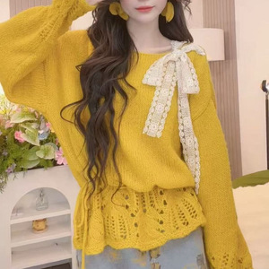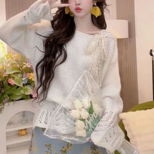 秋季新款下摆抽绳镂空针织上衣拼接蕾丝温柔宽松百搭网红甜美韩版