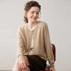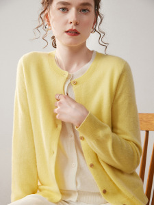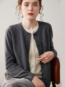 工厂批发秋冬新款假两件圆领100%纯山羊绒开衫女针织衫外套毛衣女