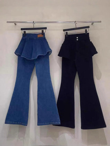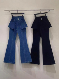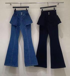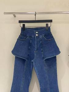 梵思羽2025秋新款假两件叠穿屁帘微喇牛仔裤女高腰显瘦弹力马蹄裤