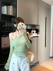 白色斜肩长袖T恤女早秋假两件蕾丝挂脖打底衫内搭短款露肩小上衣