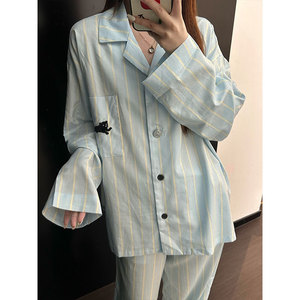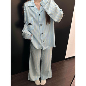 韩版蓝色条纹睡衣女秋季新款春秋季宽松休闲长袖长裤家居服套装