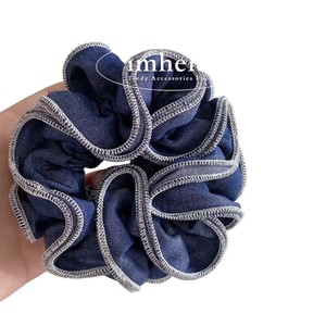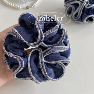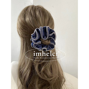 小香风蓝色亮丝木耳边大肠发圈设计感时尚通勤扎马尾头花皮筋发饰