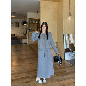 2025秋装新款胖mm大码女休闲减龄条纹披肩卫衣中长半身裙套装