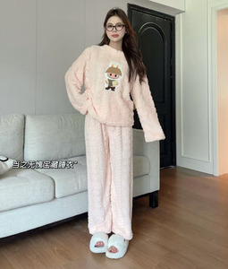 爱心梳棉绒布卡通家居服秋冬新款软绵绵加厚套装珊瑚绒保暖睡衣女