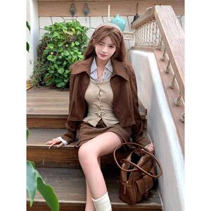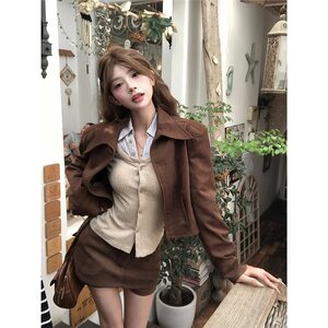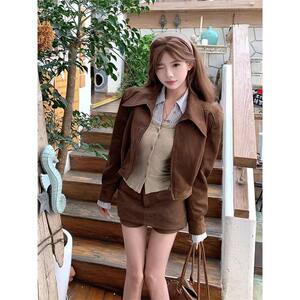 曼城往事 秋季仿麂皮绒今年流行复古高级感正肩外套辣妹半裙套装