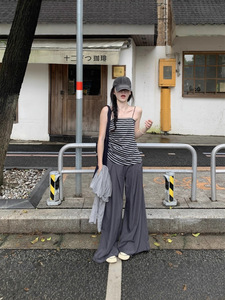 大码早秋灰色条纹吊带开衫+高级灰垂感休闲裤拖地裤三件套