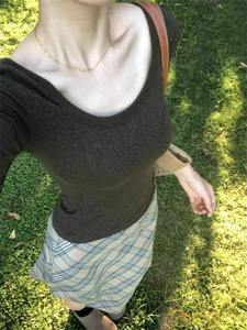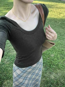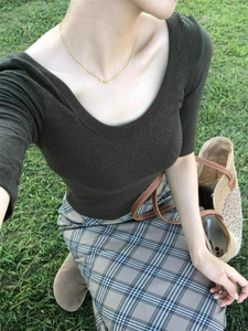 橄榄绿大U领短袖T恤女正肩夏季独特漂亮巨好看的修身显瘦中袖上衣
