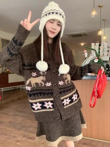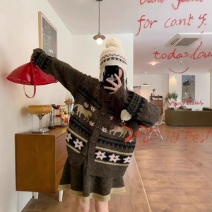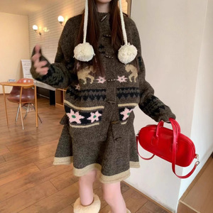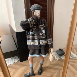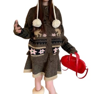 复古费尔岛加厚套装提花针织开衫半身裙冬季慵懒风两件套毛衣女装