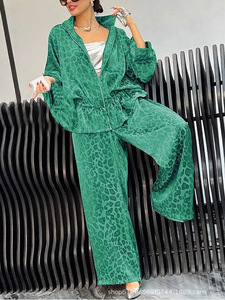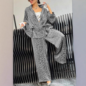 秋冬新款欧美跨境独立站亚马逊女式翻领腰部抽绳长袖豹纹休闲套装