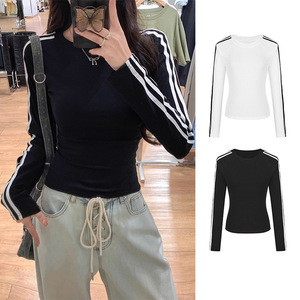 辣妹chic白色条纹长袖T恤女早秋修身插肩内搭打底衫上衣秋冬