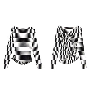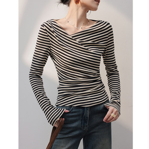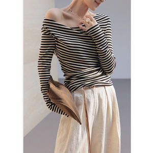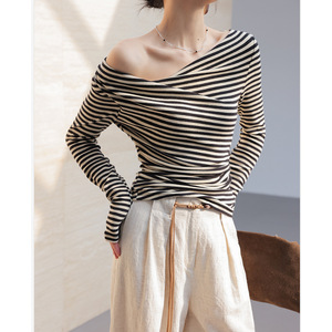显瘦荡领设计感条纹长袖斜肩T恤女 2025年早秋新款不规则上衣百搭