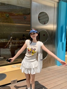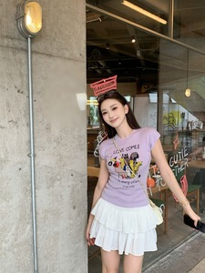 卡通印花紫色圆领针织短袖t恤女夏季别致小众修身短款小飞袖上衣