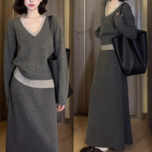 温柔风灰色针织毛衣套装连衣裙子女早秋季2025新款一整套早秋穿搭