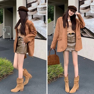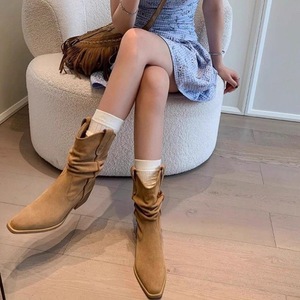 羊皮版~尖头短靴女瘦瘦靴子堆堆靴新款粗跟时尚美拉德中筒西部靴