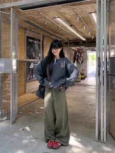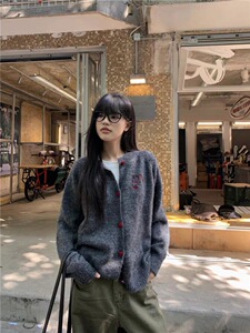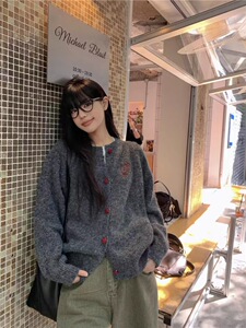 复古灰色圆领长袖针织开衫女初秋季软糯毛衣外套宽松穿搭内搭上衣