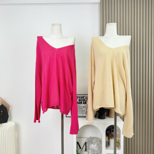 自在美女感纸片人V领斜肩长袖针织天丝亚麻混纺宽松上衣