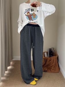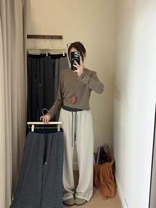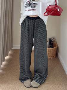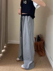 韩国东大门条纹拼接直筒高腰休闲裤女秋季新款宽松垂感抽绳阔腿裤