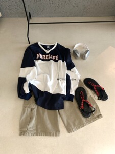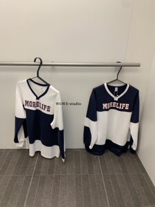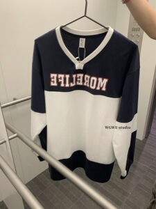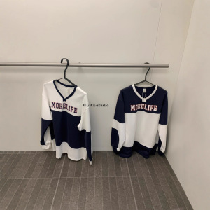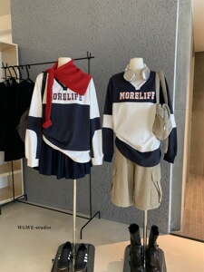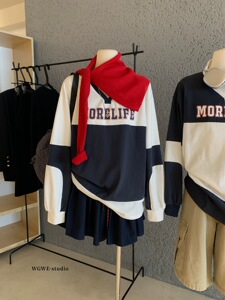 【WGWE】6891秋季新款美式球衣撞色V领长袖T恤慵懒宽松休闲上衣女