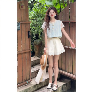 小个子绝美漂亮套装减龄拼接蕾丝短袖T恤波西米亚高腰裙裤两件套