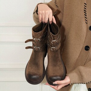 主推版~复古擦色皮带扣西部牛仔靴显瘦短靴女美拉德马丁靴机车靴